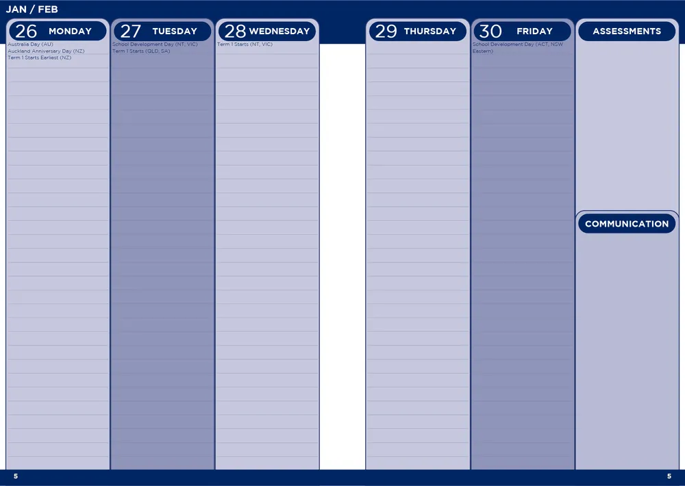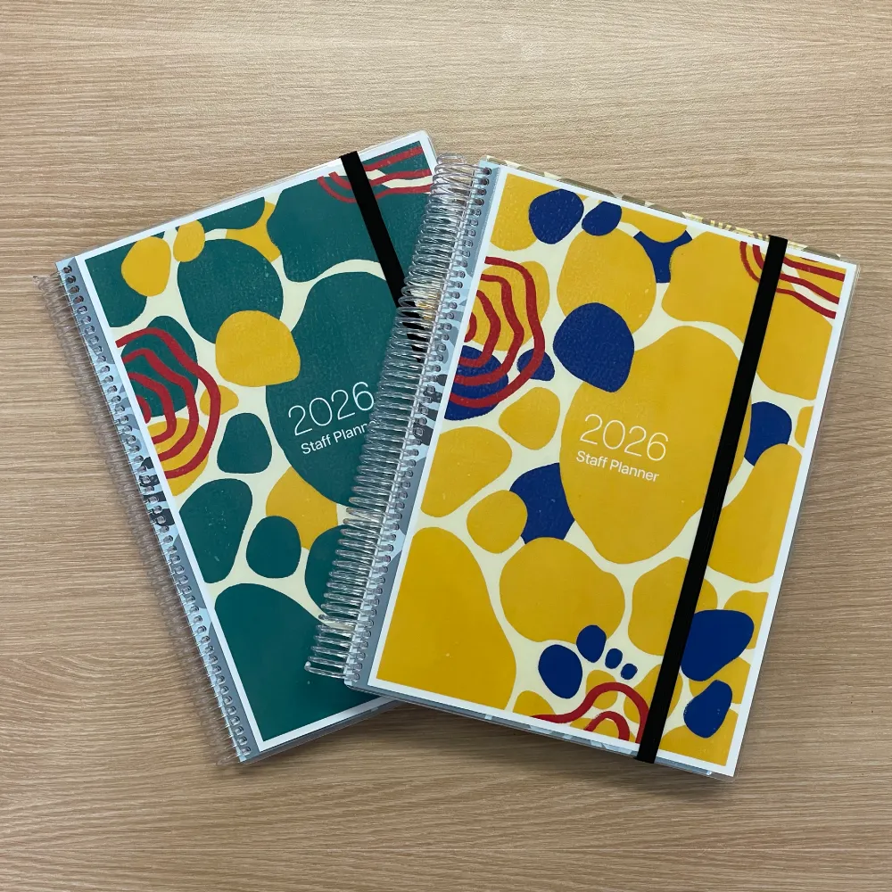 Our staff diaries are printed in A4 (standard), spiral bound, with Week to View, Week to a Page or Day to Page layouts. Choose from our standard templates or go full custom — with your school's specific period structure, bell times and school dates — from just 25 orders.