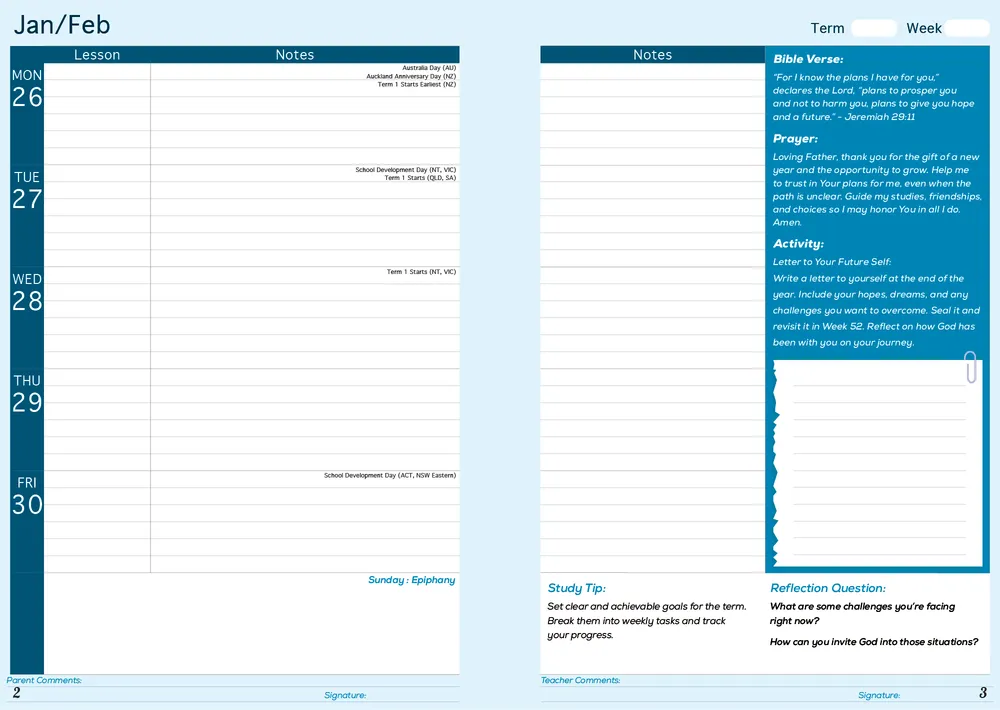 Encourages students to explore faith. Weekly scripture and reflection space. Ideal for faith-based schools.