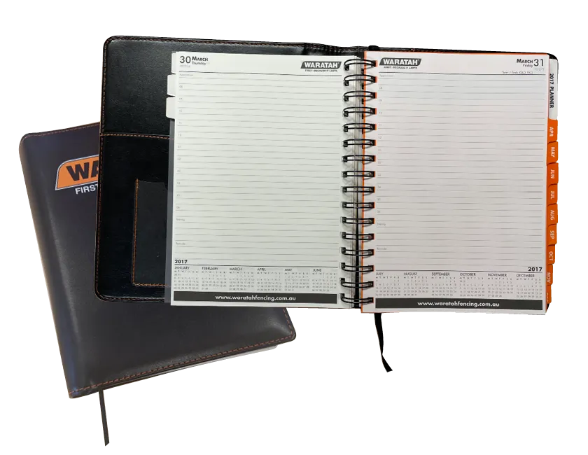 Our standard staff diaries are printed in A4, spiral bound, and available in Week to View, Week to a Page or Day to Page layouts. Full colour personalised cover, with custom pages in greyscale or colour. Simple, professional, effective.