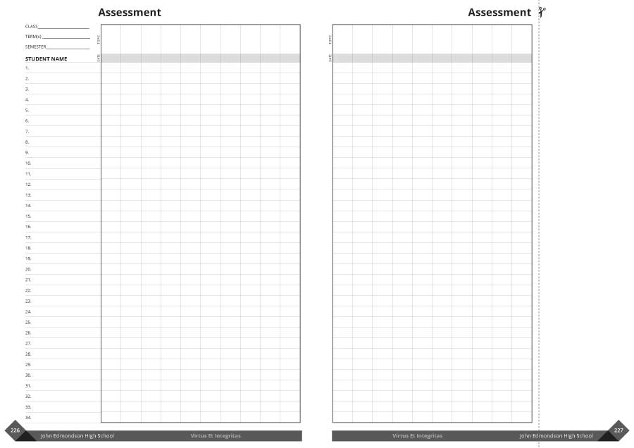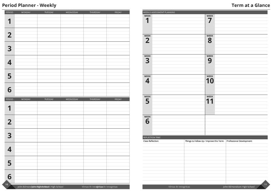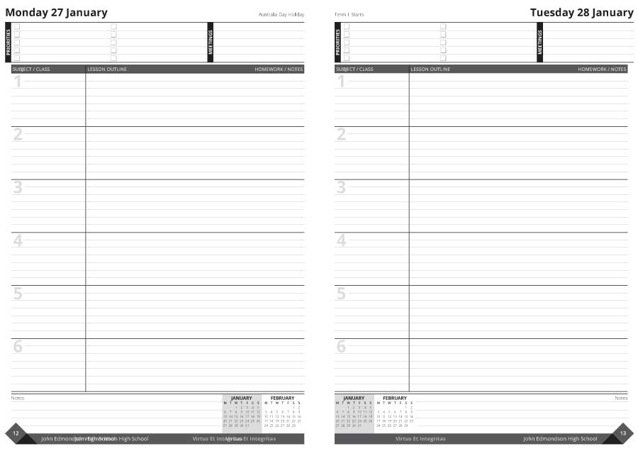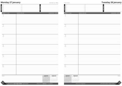 For orders of 25 and more the daily diary section is personalised to your school’s class structure to include the number of periods you have as well as bell times.