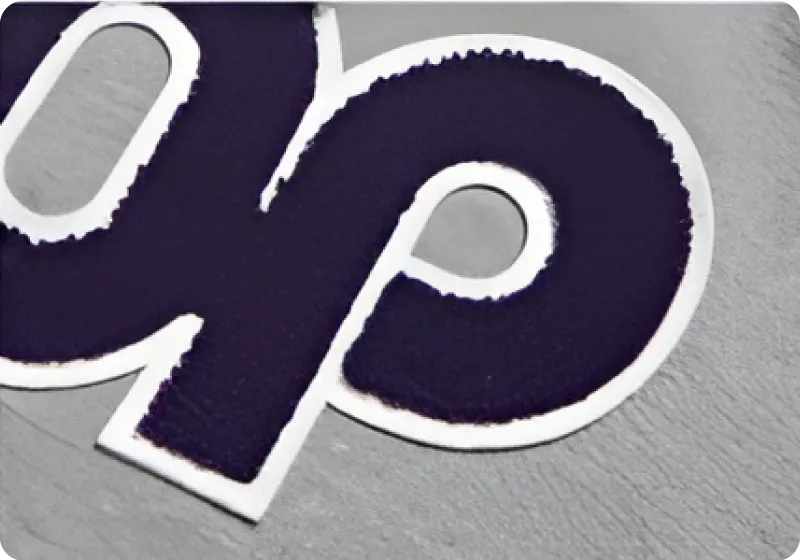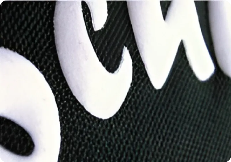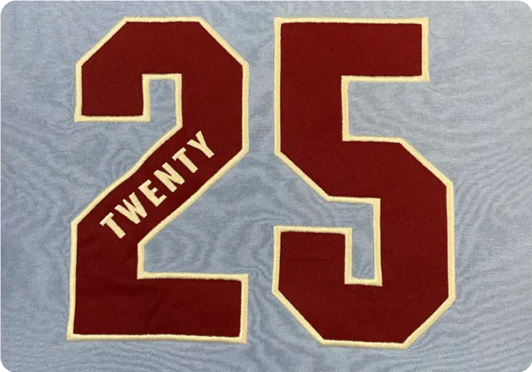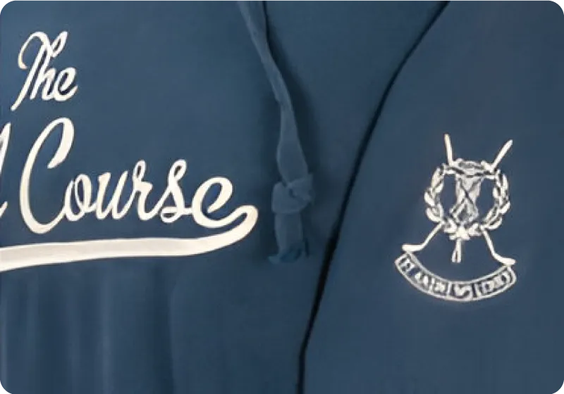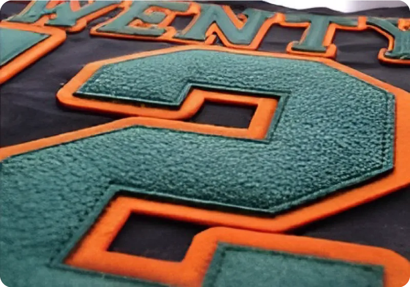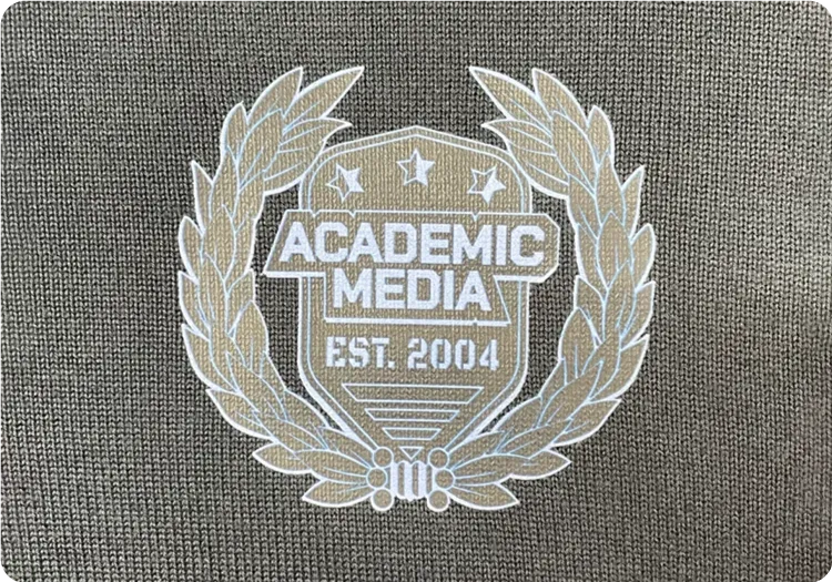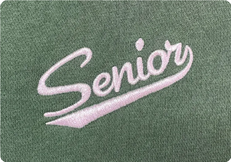 We offer embroidery, vinyl transfer, sublimation, digital transfer, appliqué and screen print as standard methods. We also offer advanced options including puff print, distressed foil, flock appliqué, felt appliqué, chenille appliqué and chain stitch appliqué.