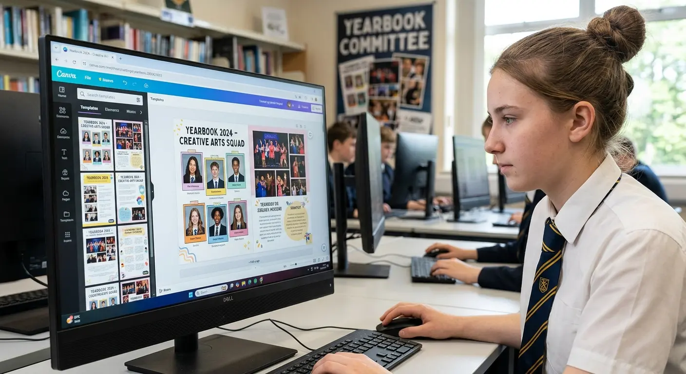 Canva is the go-to for most school yearbook teams. It's free (or very low cost), runs in your browser, and requires no design experience to get great results. Students can collaborate in real-time, making it perfect for shared class projects.
